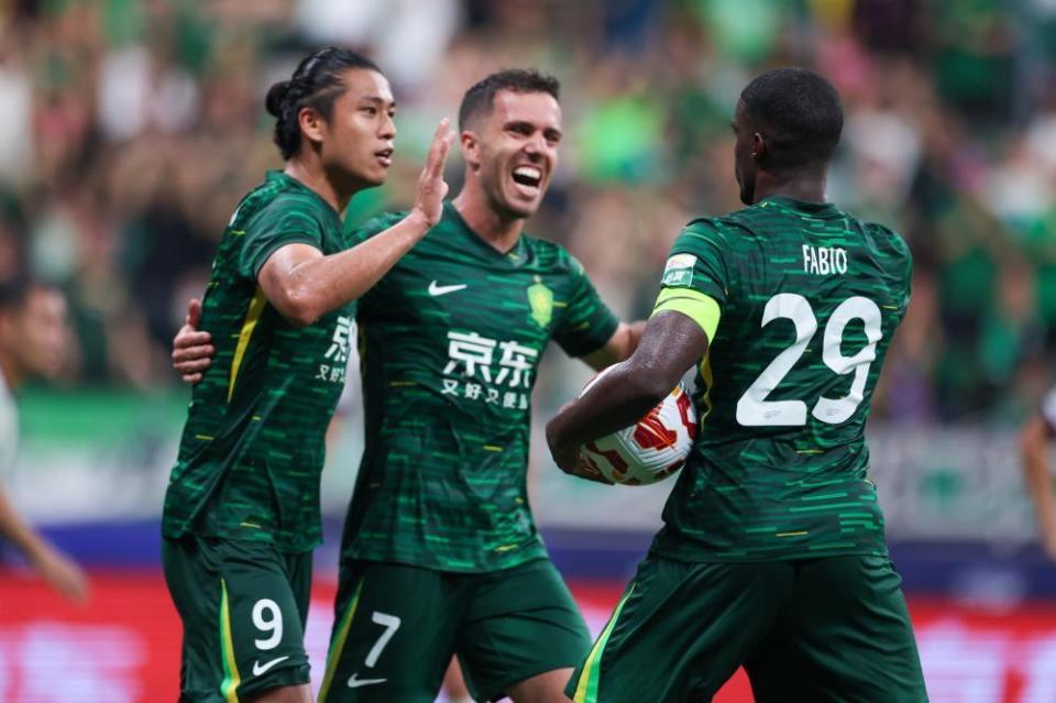 第25分钟,张玉宁斜传,法比奥禁区内被贺惯撞倒。主裁判回看慢镜头之后判罚点球,法比奥主罚点球破门,国安打破僵局。
