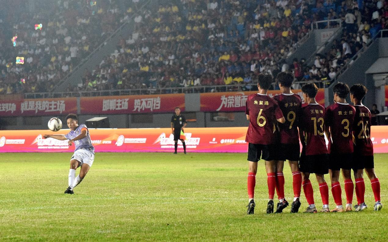 邯山星火队的球员曹子轩在发任意球。郝群英摄