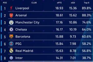 机构预测联赛阶段(排名、球队、预期积分、预期净胜球、前八概率):