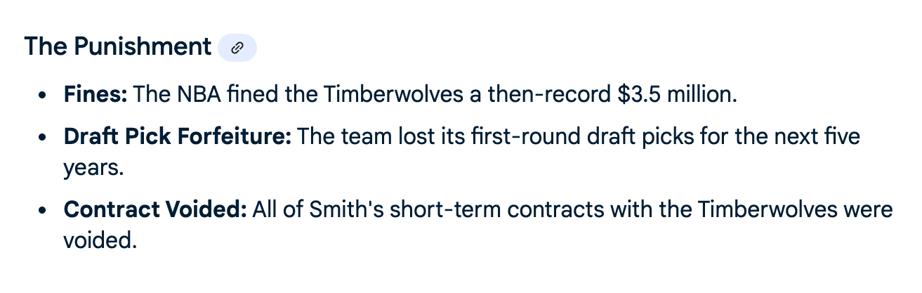 2000年乔·史密斯的经纪人离开原经纪公司,双方发生矛盾对簿公堂,原经纪公司直接曝光了乔·史密斯与森林狼的阴阳合同:原来森林狼为了获得乔·史密斯的鸟权,能够帽上续约,必须跟乔·史密斯连续签三次一年的短期合同,在此之后乔·史密斯将获得6年8600万美元的大合同,乔·史密斯的经纪人与森林狼老板私底下达成了协议。